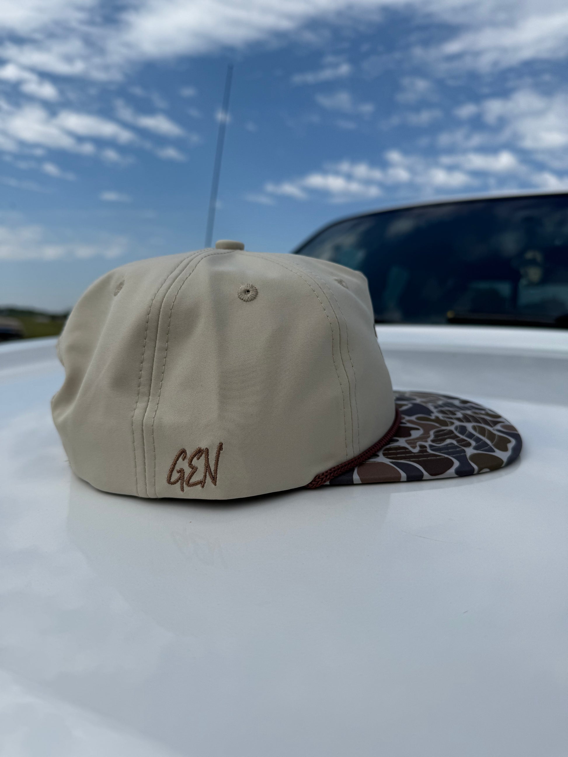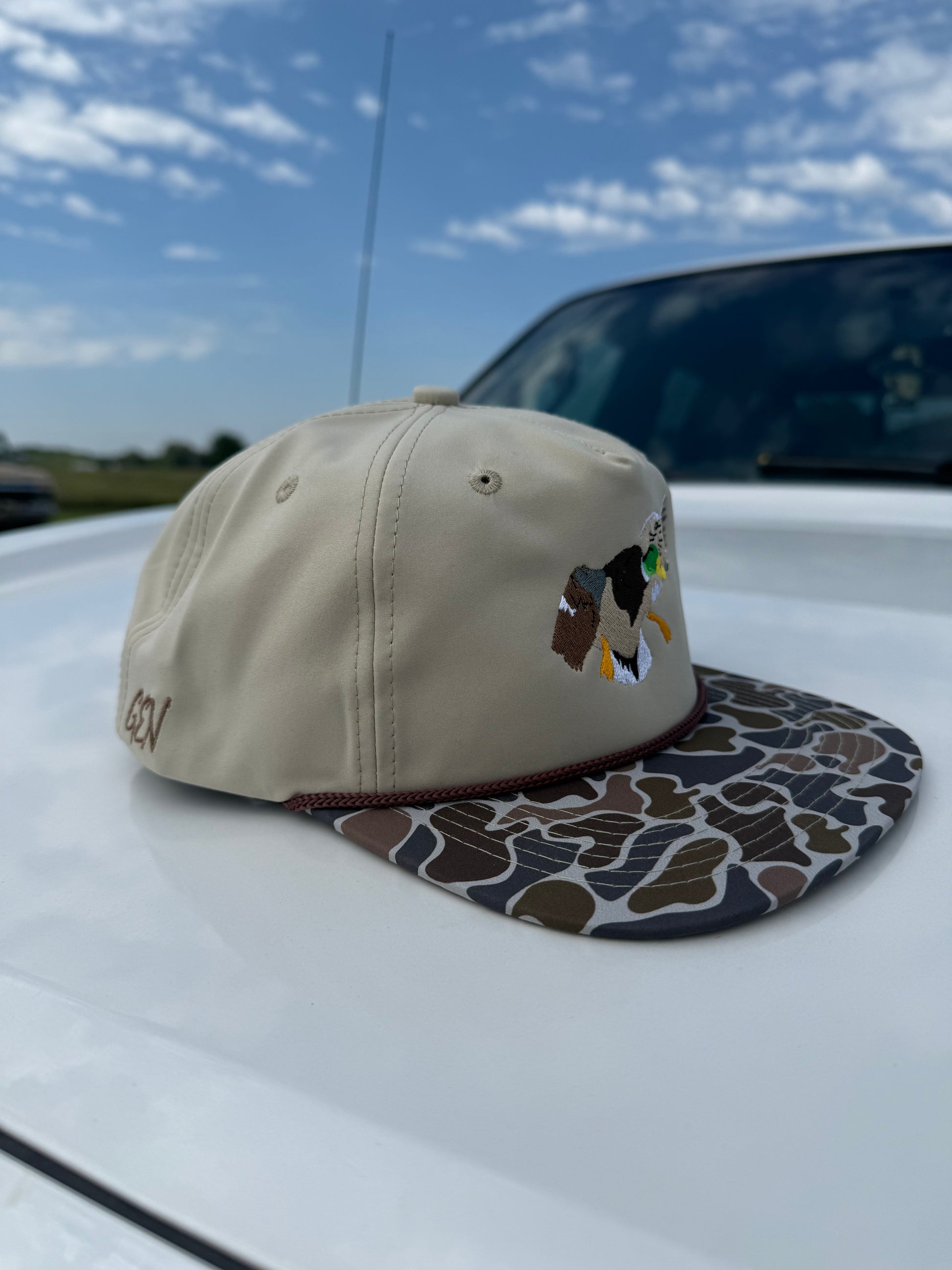 The Fully Cupped hat features a hard-charging mallard embroidered front and center, paired with a duck camo bill and a clean khaki crown. Built for early mornings in the blind or late nights swapping stories.
