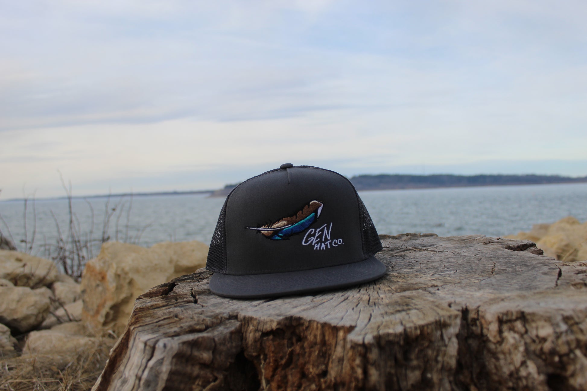 The Free Flight in grey is a tribute to wide skies, early mornings, and that unmistakable whistle of wings overhead. Featuring a detailed blue-wing teal feather and bold GEN Hat Co. script, this high-crown trucker combines clean lines with serious meaning. Whether you're chasing the migration or just keeping it casual, this one’s built for the long haul.