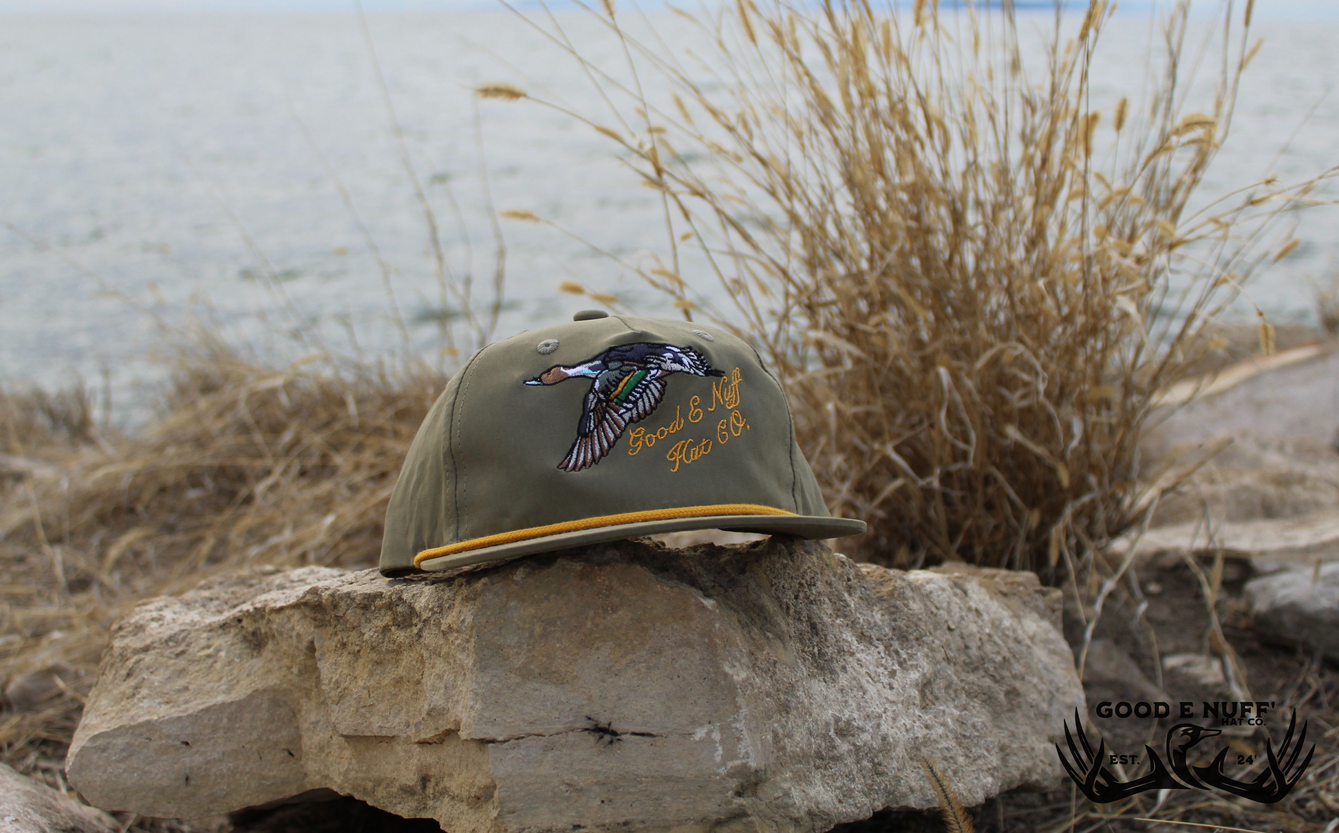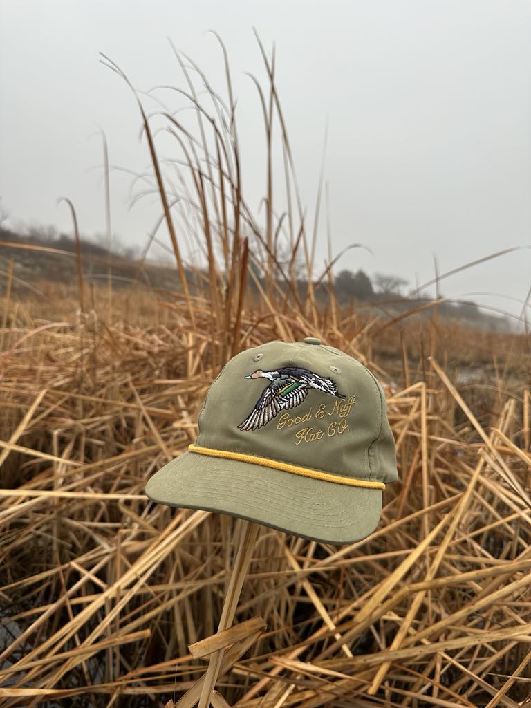Bring vintage vibes to your everyday style with the Old School Pintail hat. Featuring a detailed embroidered pintail duck in flight and the iconic "Good E Nuff' Hat Co." text, this hat is a nod to timeless outdoor traditions. With its rugged olive base and retro rope detail, it’s perfect for duck hunters, outdoor enthusiasts, or anyone looking to embrace a classic, old-school look. Whether you’re in the blind or out on the town, the Old School Pintail is built to impress