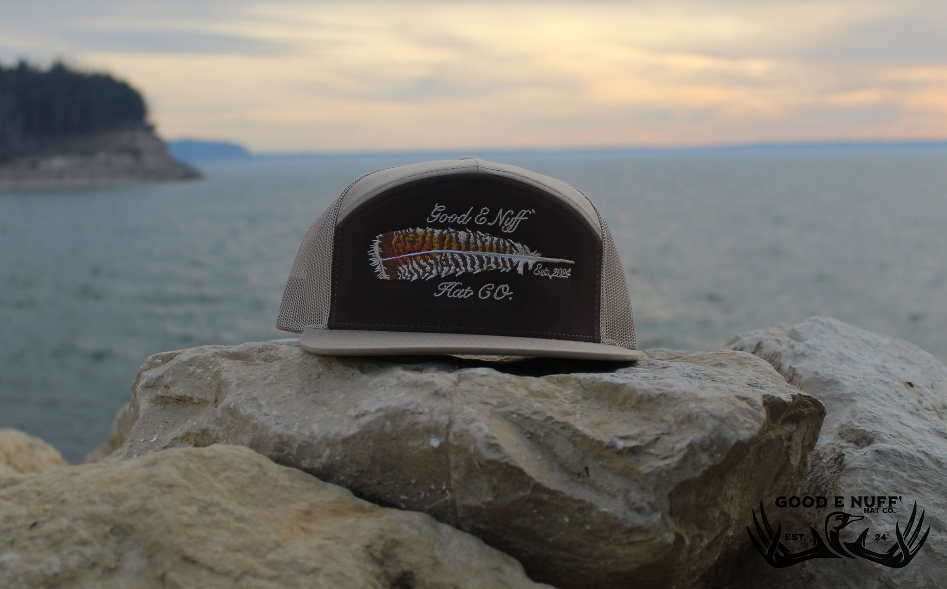 Gear up for the thrill of the hunt with The Roost, featuring a beautifully embroidered turkey feather graphic that pays homage to roost busting. This hat combines rustic charm with rugged durability, making it perfect for those early mornings in the field or relaxing afternoons with friends. With its earthy tones and classic "Good E Nuff' Hat Co." embroidery, The Roost is built for turkey hunters and outdoor enthusiasts who live for the wild.
